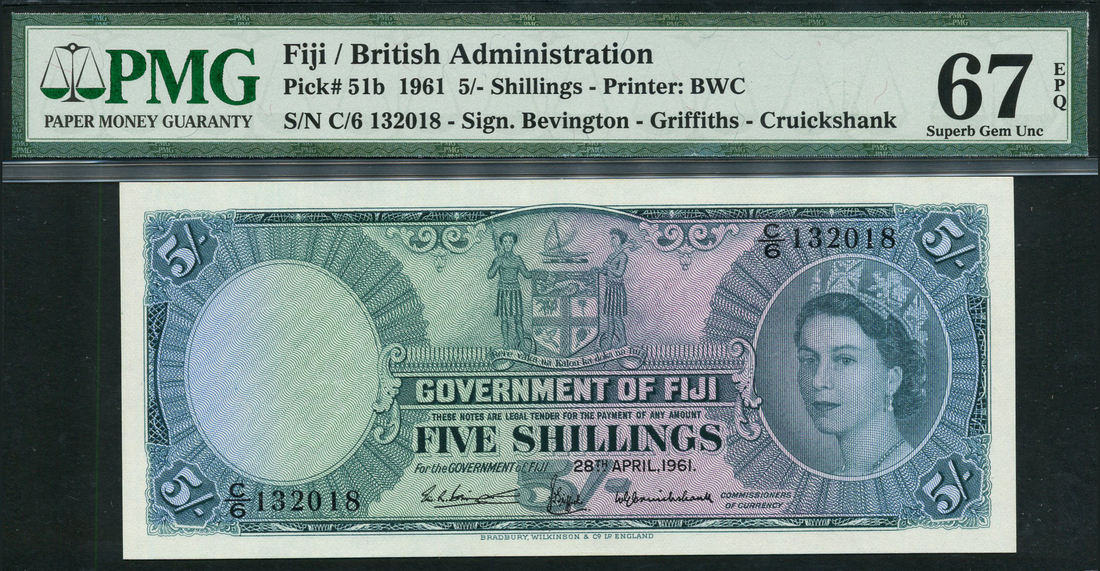 (x) Government of Fiji, 5 shillings, 28 April 1961, serial number C/6 132018, teal on multicolour underprint, Elizabeth II at right, arms at top centre, reverse teal, value at centre