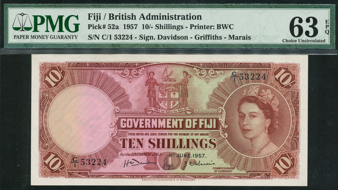 (x) Government of Fiji, 10 shillings, 1 June 1957, serial number C/1 53224, red-brown on multicolour underprint, Elizabeth II at right, arms at top centre, reverse red-brown, value at centre