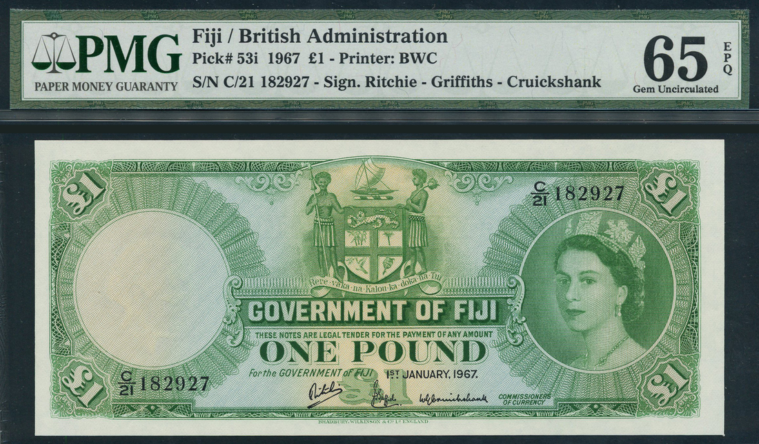 (x) Government of Fiji, £1, 1 January 1967, serial number C/21 182927, green on multicolour underprint, Elizabeth II at right, arms at top centre, reverse green, value at centre