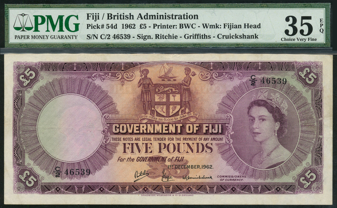 (x) Government of Fiji, £5, 1 December 1962, serial number C/2 46539, purple on multicolour underprint, Elizabeth II at right, arms at top centre, reverse purple, value at centre