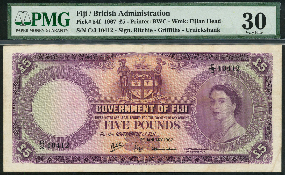 (x) Government of Fiji, £5, 1 January 1967, serial number C/3 10412, purple on multicolour underprint, Elizabeth II at right, arms at top centre, reverse purple, value at centre