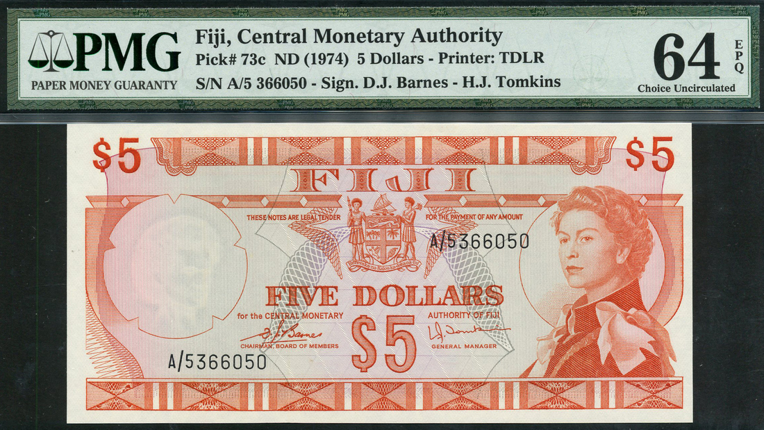 (x) Central Monetary Authority of Fiji, $5, ND (1974), serial number A/5 366050, orange on multicolour underprint, Elizabeth II at right, arms at top centre, value at low centre and top left and right, reverse orange