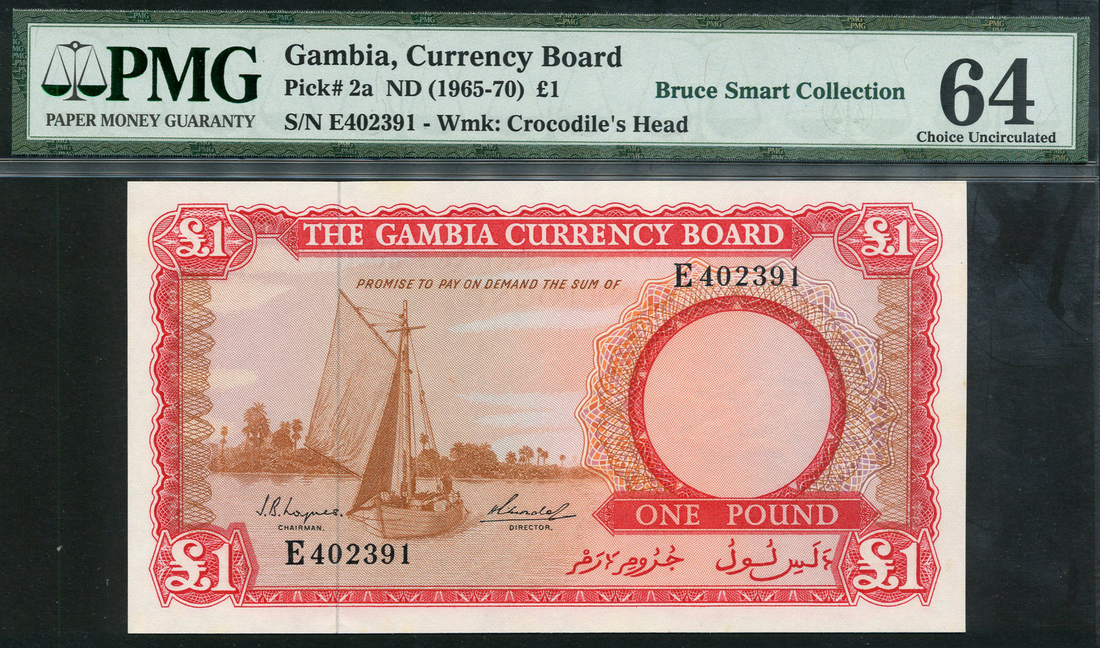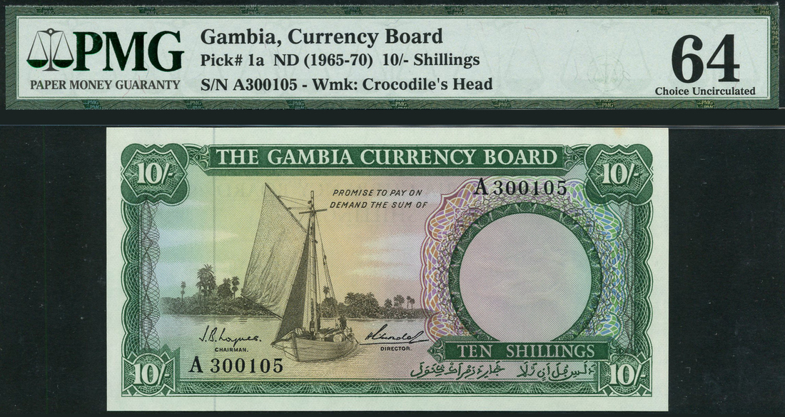 (x) Gambia Currency Board, 10 shillings and £1, ND (1964), prefixes A and E, green and red respectively, sailing boat on River Gambia at left, value at each corner