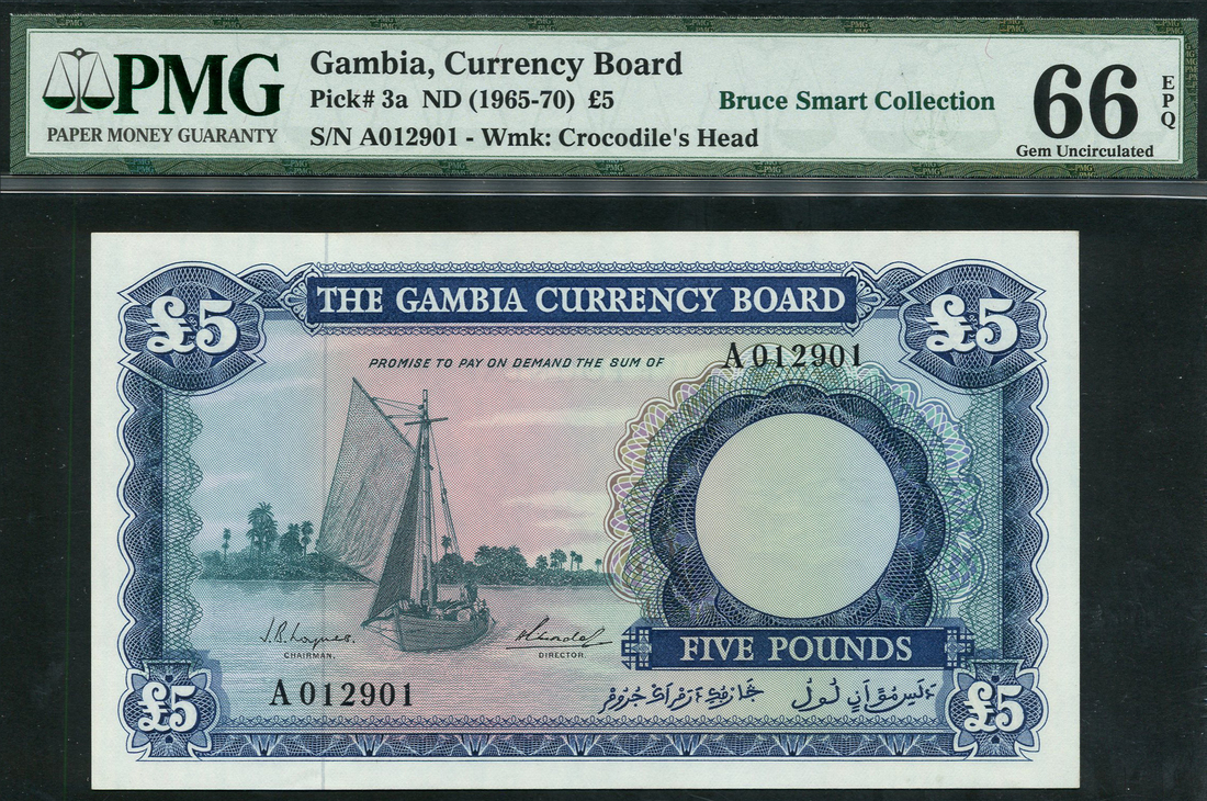 (x) Gambia Currency Board, £5, ND (1964), serial number A012901, blue on multicolour underprint, sailing boat on River Gambia at left, value at each corner, reverse blue, milling machine at centre