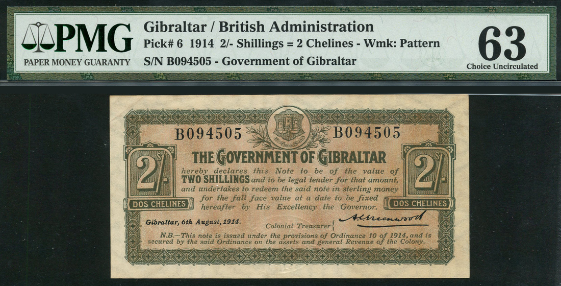 (x) Government of Gibraltar, 2 shillings, 6 August 1914, serial number B094505, uniface, green on tan underprint, arms at top centre, value at left and right
