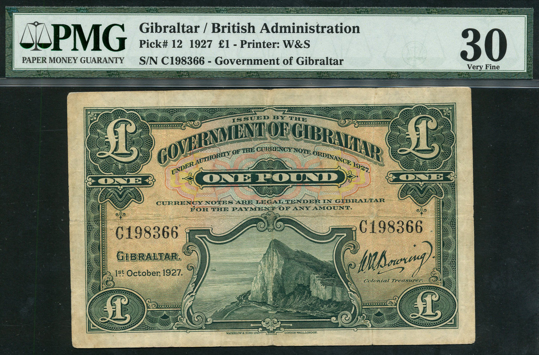 (x) Government of Gibraltar, £1, 1 October 1927, serial number C198366, green on multicolour underprint, Rock of Gibraltar at left, value at low right and each corner, reverse green, arms at centre, value at left and right