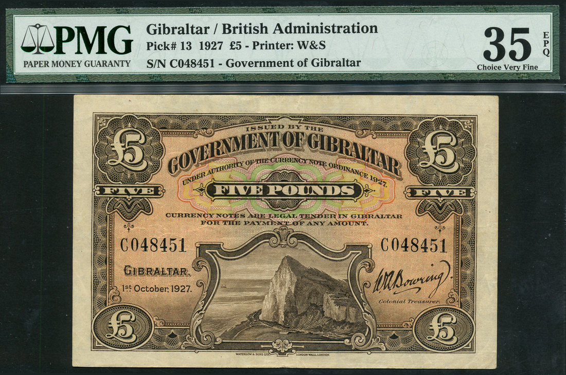 (x) Government of Gibraltar, £5, 1 October 1927, serial number C048451, brown on multicolour underprint, Rock of Gibraltar at left, value at low right and each corner, reverse brown, arms at centre, value at left and right