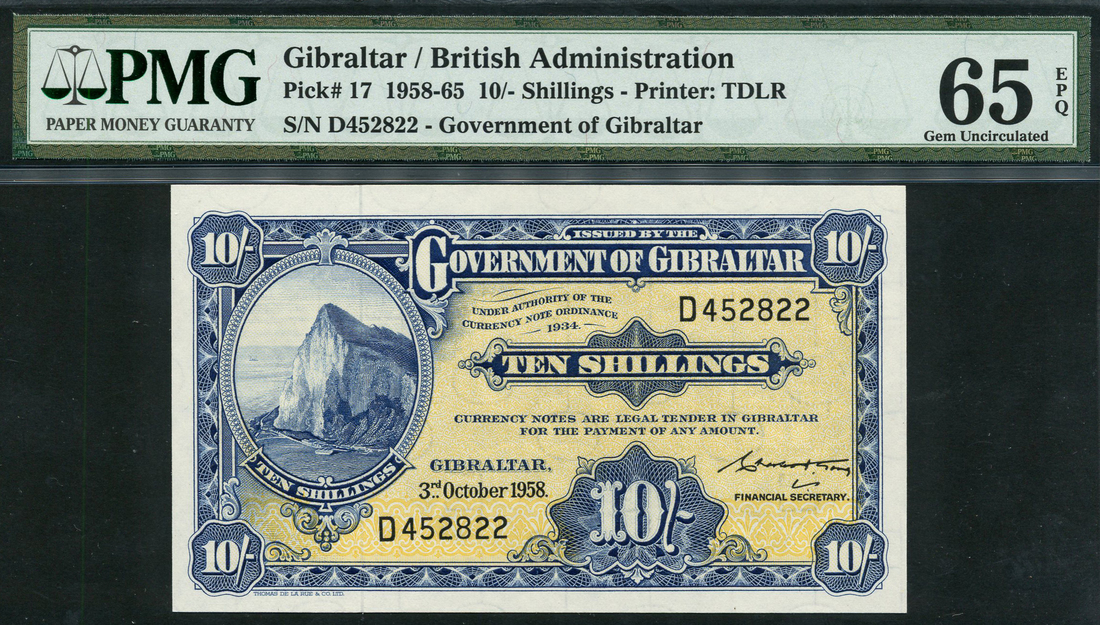 (x) Government of Gibraltar, 10 shillings, 1 July 1958, serial number D452822, blue on yellow underprint, Rock of Gibraltar at left, value at low right and each corner, reverse blue, arms at centre, value at left and right