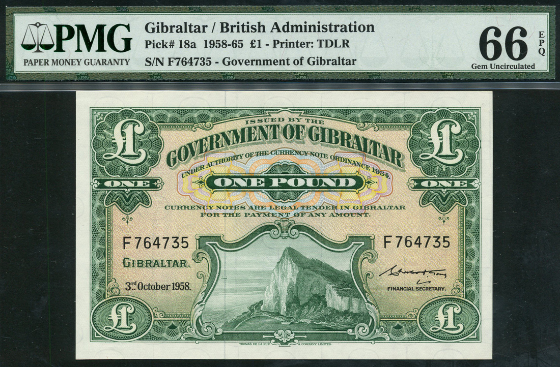 (x) Government of Gibraltar, £1, 3 October 1958, serial number F764735, green on multicolour underprint, Rock of Gibraltar at low centre, value at top centre and each corner, reverse green, arms at centre, value at left and right