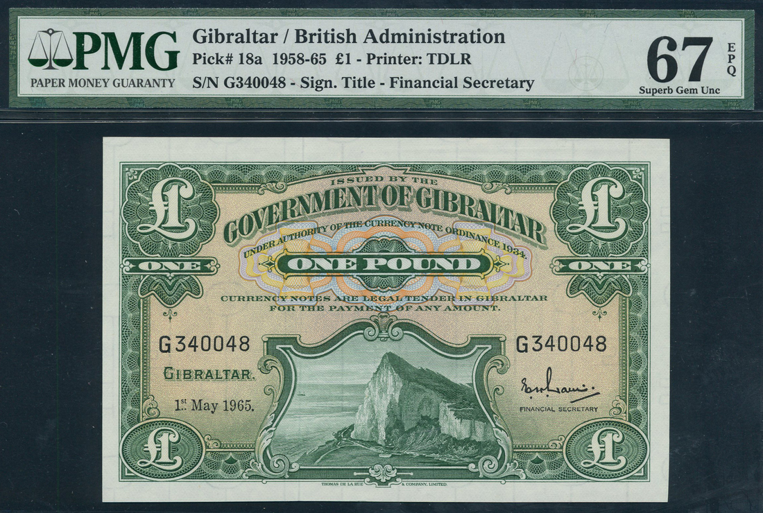 (x) Government of Gibraltar, £1, 1 May 1965, serial number G340048, green on multicolour underprint, Rock of Gibraltar at low centre, value at top centre and each corner, reverse green, arms at centre, value at left and right