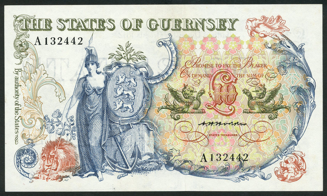 (x) States of Guernsey, £10, 1975, serial number A132442, blue, red and brown on multicolour underprint, Britannia at left, value at right, reverse blue, Battle of Queenston Heights at centre, Major General Sir Isaac Brock at right
