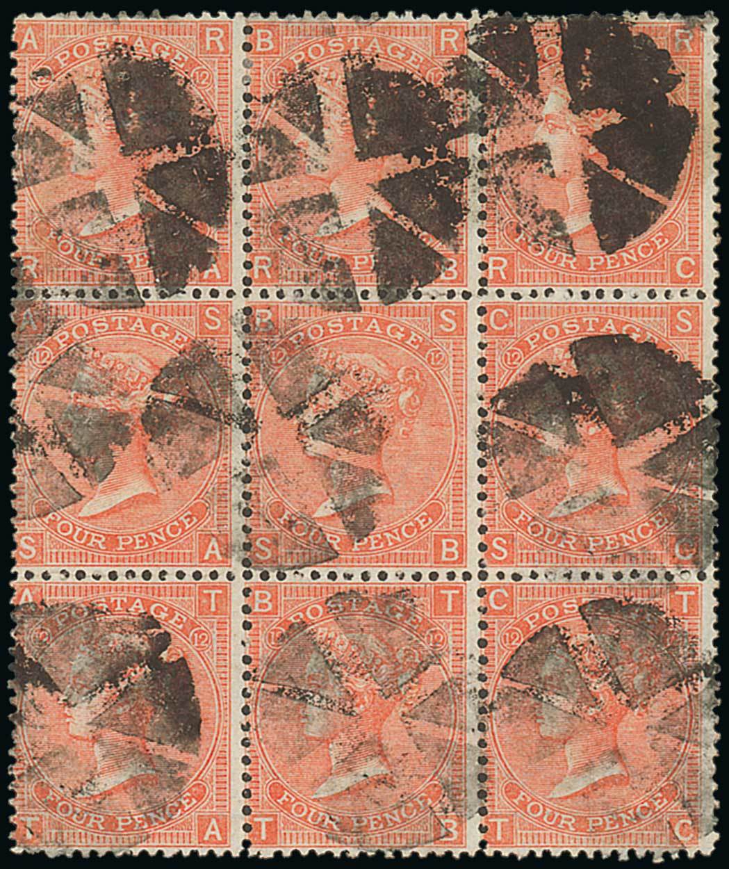 4d. vermilion Plate 12 block of nine, RA-TC, each with neat segmented cork cancellation; trace of a crease at centre and a couple of short perfs. at top, otherwise sound. A rare multiple. Sc. 43; S.G. 94, £675+. Photo