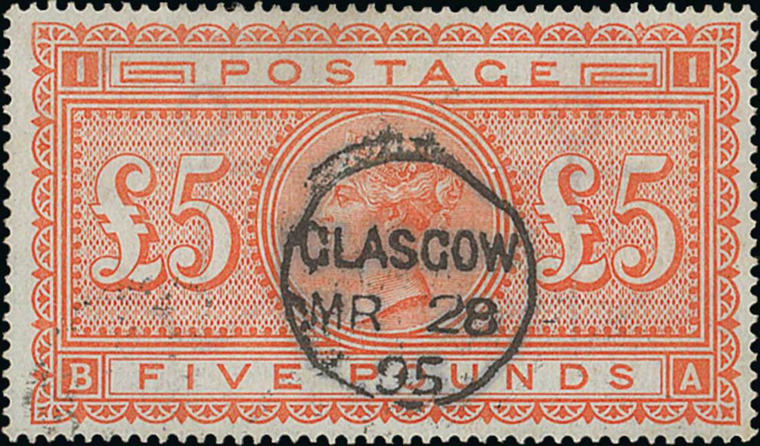 £5 orange, BA, neatly cancelled with Glasgow 1895 datestamp; an attractive example of this high value. Sc. 93;