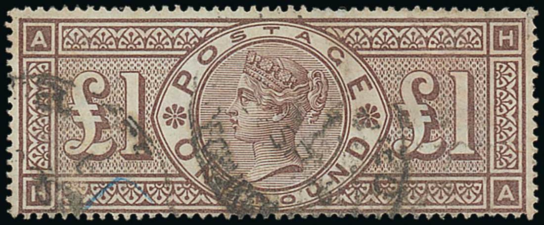 £1 brown-lilac, HA, cancelled with two part indistinct oval registered datestamps, small blue crayon mark at lower left corner; sound. Sc. 110; S.G. 185, £2,800. Photo