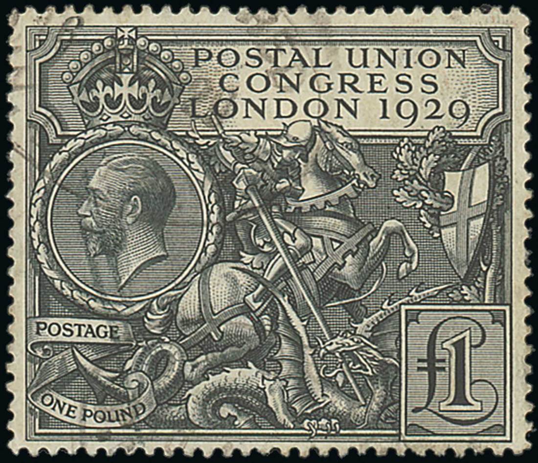 1929 U.P.U. £1 black, cancelled with parts of two registered oval datestamps and with two "lines" at lower left. Sc. 208; S.G. 438, £550. Photo