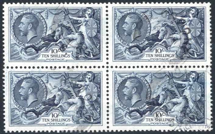 1934 Re-engraved, 10/- indigo block of four lightly cancelled with London 1939 datestamps; sound. Sc. 224; S.G. 452, £320+