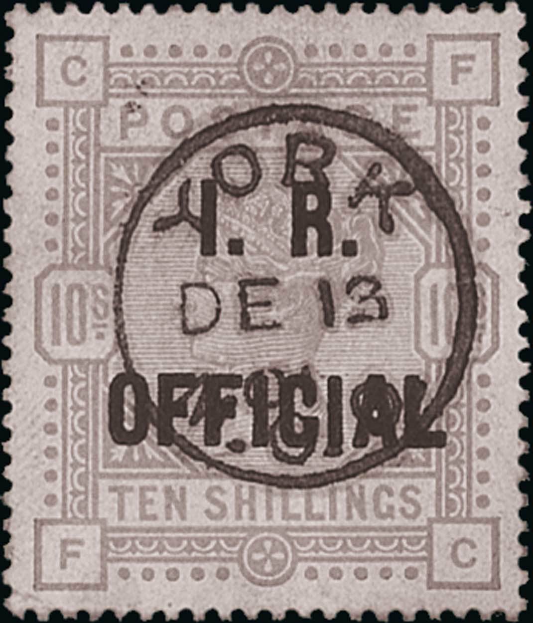 1890 10/- ultramarine, FC, neatly cancelled with York 1901 datestamp; small corner crease at lower left, otherwise fine. Rare. B.P.A. Certificate (1990). Sc. O9; S.G. O10, £3,750. Photo
