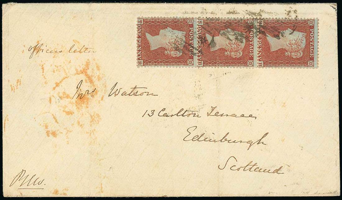 1855 (Feb.) "Officers letter" envelope to Scotland, bearing G.B. 1d. Stars vertical strip of three with indistinct "OXO" cancellations, faint British Army Post Office and London and Edinburgh (22.2) datestamps on reverse; some creases, two of which cross the strip, Also 1d. Stars strip of three twice cancelled with fine "OXO". Photo