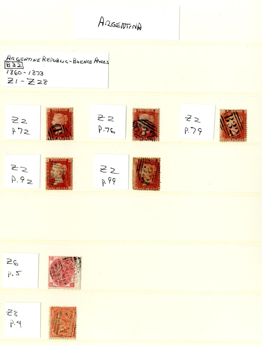 A selection of loose adhesives cancelled "B32" in Buenos Aires, comprising 1d. (5), 3d., 4d. (5 with a pair), 6d. buff, 9d., 10d. (reduced wing-margin) and 1/- (6 different including 1856 and 1862, one on piece with 4d.); generally good to fine strikes. Cat. £2,000+