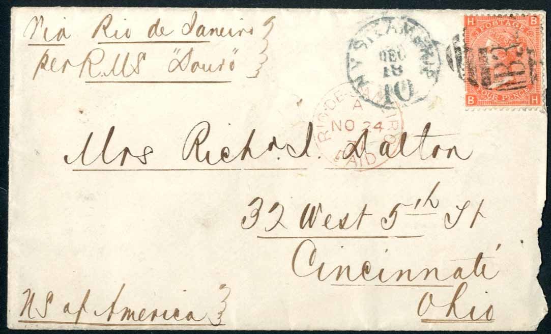 1871 (14 Nov.) envelope from Buenos Aires "Via Rio de Janeiro per RMS Douro" to USA, bearing 4d. vermilion Plate 12 cancelled "B32" with British Post Office Rio de Janeiro Paid (24.11) and "n.y. steamship/10" (18.12) datestamps alongside, sender's cachet and British Post Office datestamp on reverse