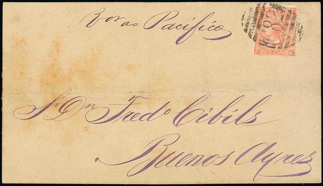1874 (21 Feb.) entire from Pernambuco to Buenos Aires, bearing 4d. vermilion Plate 13 cancelled with complete largely fine "C82", part despatch datestamp on reverse. Photo