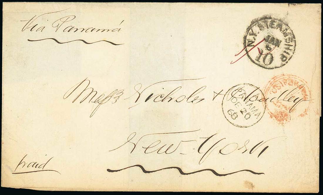 1868 (3 Dec.) entire from Valparaiso "Via Panama" to New York, rated "1/-" and showing a fair strike of the Crowned Circle "paid/at/valparaiso" alongside Panama (20.12) and New York Steamship (6.1) datestamps, despatch double-arc datestamp on reverse. Photo
