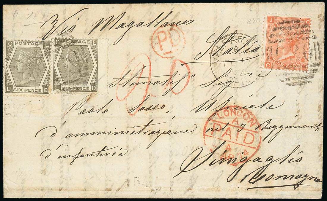 1874 (17 Feb.) large part entire from Valparaiso "via Magallanes" to an infantry man in Italy, bearing 4d. vermilion Plate 13 and 6d. grey Plate 12 (2, one with wing-margin) all cancelled with "C30" duplex, showing London Paid datestamp (3.4) and circular-framed "pd", arrival datestamp (5.4) on reverse; crease through the 4d. and one 6d. though clean and attractive. Photo