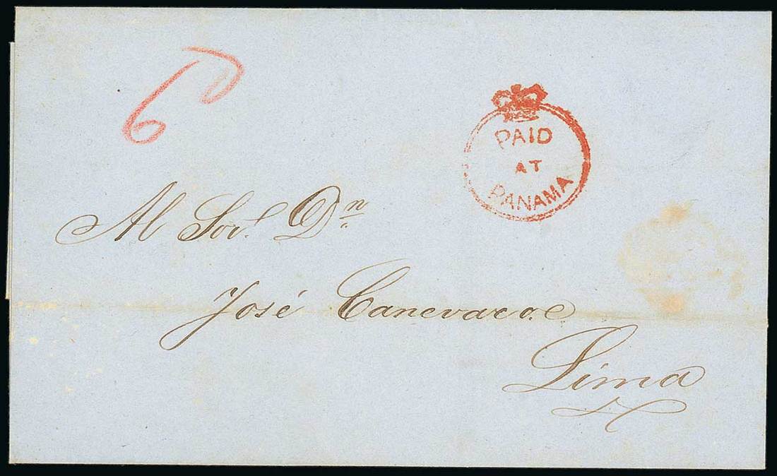 1860 (9 June) entire from Panama to Lima, rated "6d" in red crayon and showing fine Crowned Circle "paid/at/panama", despatch double-arc datestamp on reverse; scarce. S.G. CC1, £1,900. Photo