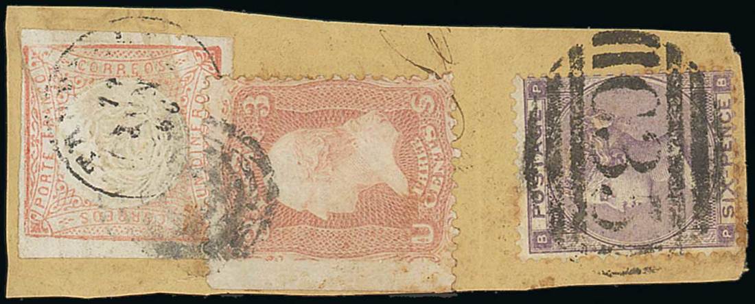 1866 piece bearing Peru 1862 1p. red with indistinct 1866 datestamp and in combination with U.S. 1861-62 3c. rose with indistinct target cancellation tying the two together, and G.B. 1862-64 6d. lilac cancelled with superb "C35" of Panama; a couple of small faults though a rare triple mixed franking. Photo