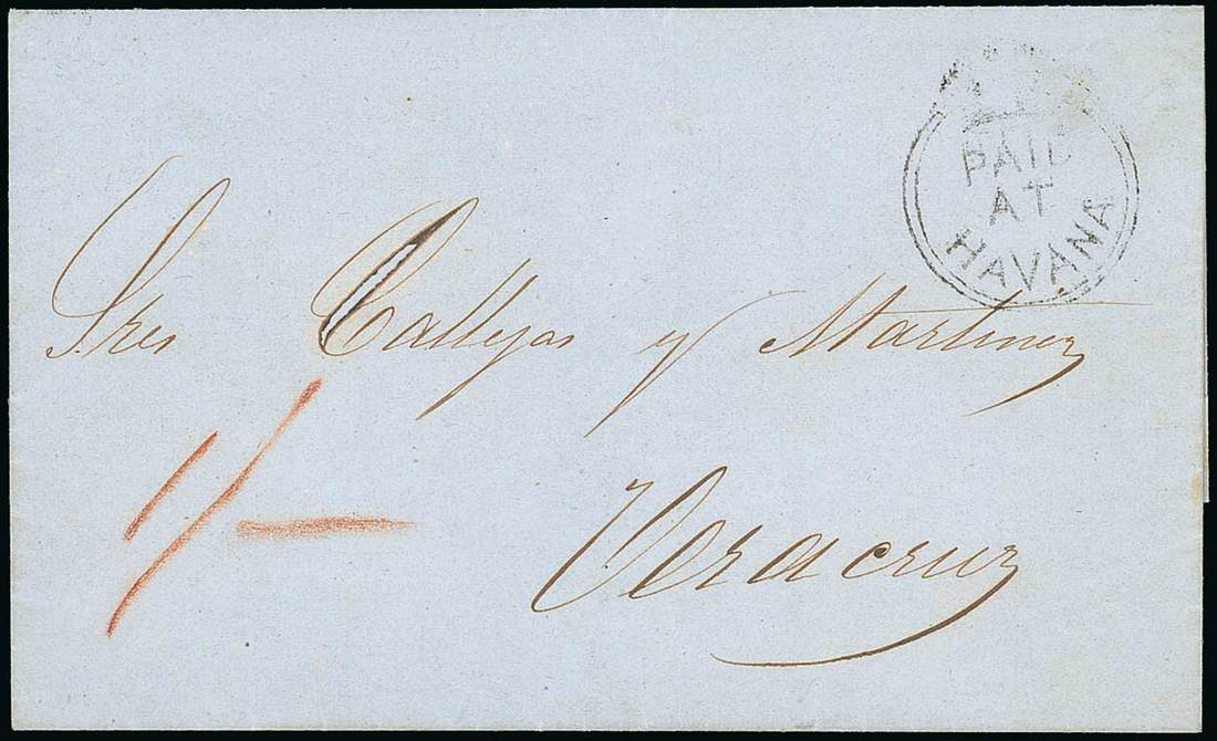 1855 (25 May) entire from Havana to Vera Cruz, rated "1/-" in red crayon and showing good strike of the sans-serif Crowned Circle "paid/at/havana", despatch double-arc datestamp on reverse; clean and attractive. S.G. CC3, £1,000. Photo