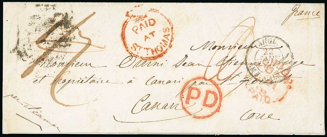 1857 (30 Dec.) envelope (opened-out) to France, showing fine Crowned Circle "paid/at/st. thomas", London Paid c.d.s. (21.1), circular-framed "pd" and French entry datestamp (22.1), the reverse with despatch double-arc datestamp and three French c.d.s. S.G. CC1, £500. Photo