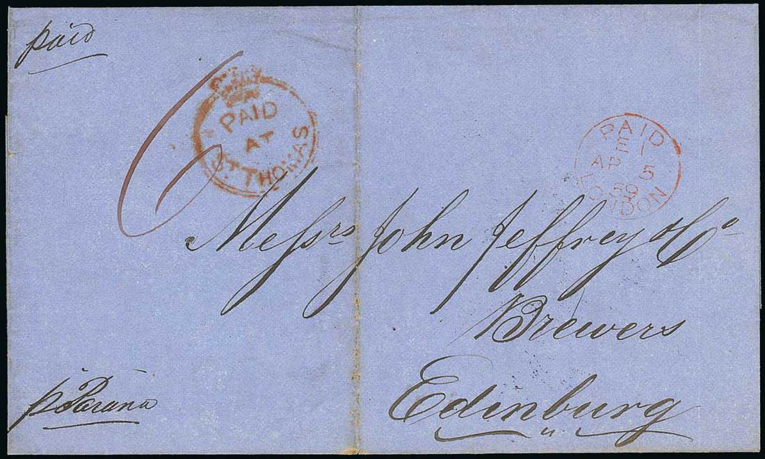 1859 (17 Mar.) entire "p Parana" to Edinburgh, rated "6" and showing fine Crowned Circle "paid/at/st. thomas" with London Paid datestamp (5.4) at right, the reverse with despatch and arrival (6.4) c.d.s.; all markings clear of central filing crease. S.G. CC1, £500. Photo