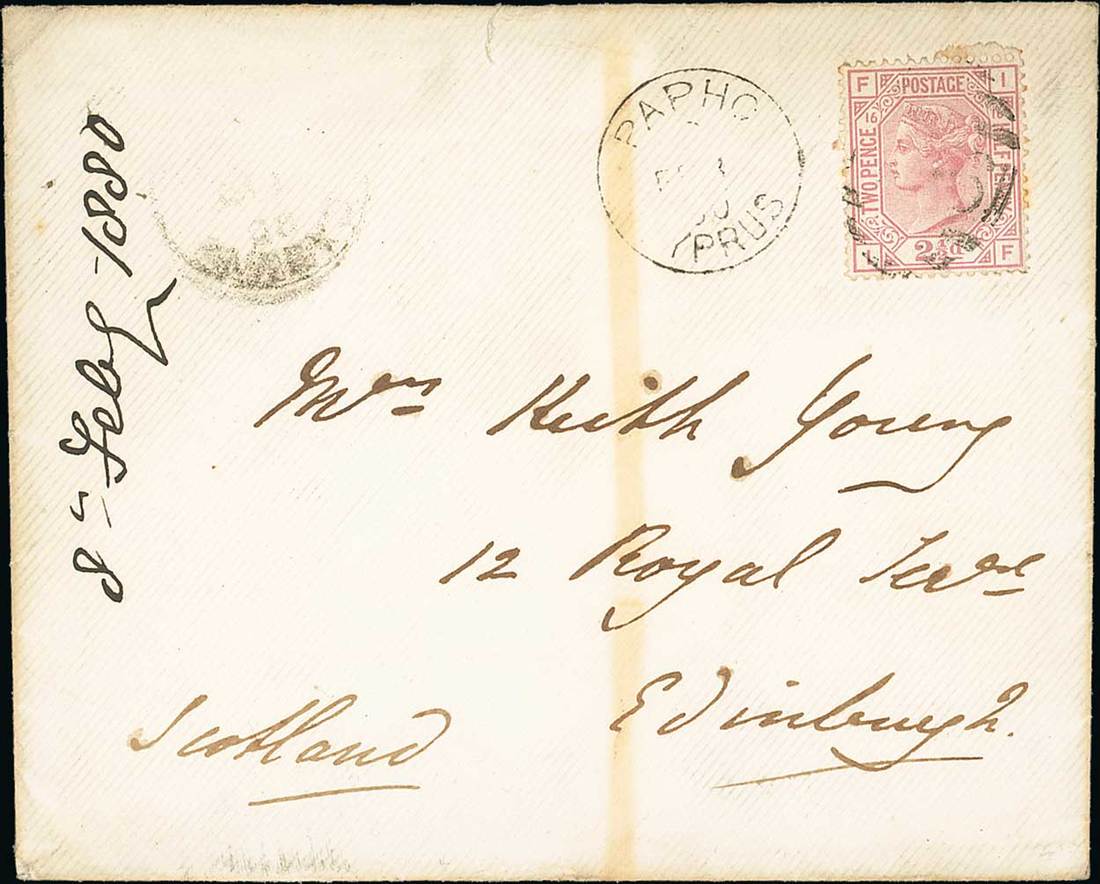 2½d. rosy mauve Plate 16, IF, mainly lightly cancelled and affixed on 1880 (Feb.) envelope (regimental crest on flap) from Keith Young to his mother in Edinburgh, clear Paphos datestamp alongside the adhesive, Limassol, Larnaca and Edinburgh (19.2) datestamps overlapping on reverse; rubber band stain on face, otherwise sound and accompanied by an earlier letter written to his mother. A scarce stamp on cover. Philatelic Expertising Certificate (1994). S.G. A46; S.G. Z47. Photo