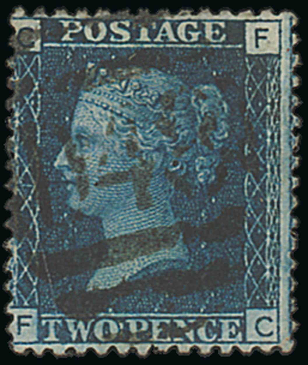 2d. blue Plate 15, FC, with a good upright strike; lower right corner perf. creased, otherwise fine. Scarce. Photo