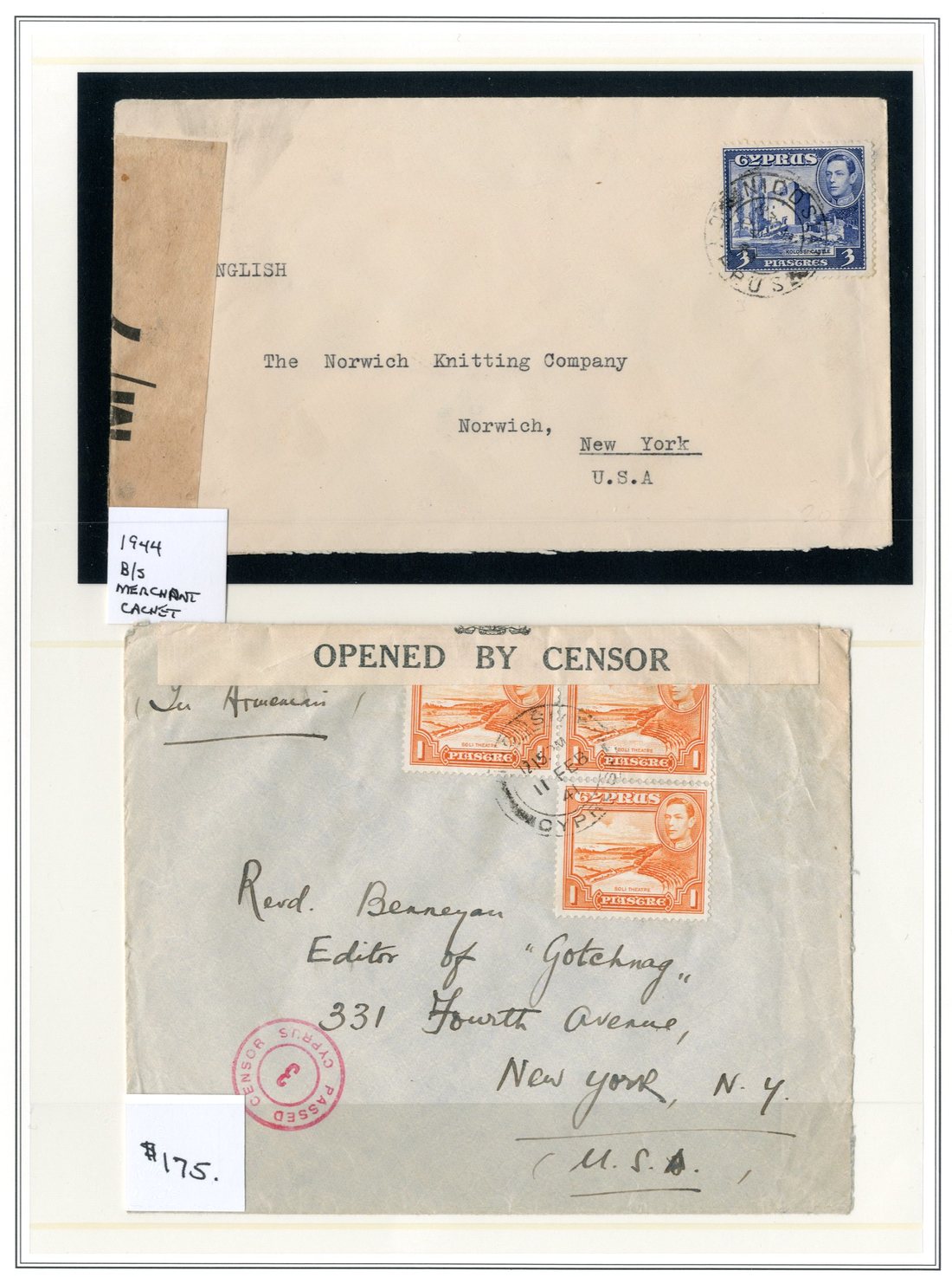 1941 envelope from Nicosia to New York bearing 1pi. (3) and with censor tape and "passed censor/3/cyprus" handstamp in red, and 1944 envelope from Nicosia to New York bearing 3pi. and with "opened by examiner/m/7" label at left