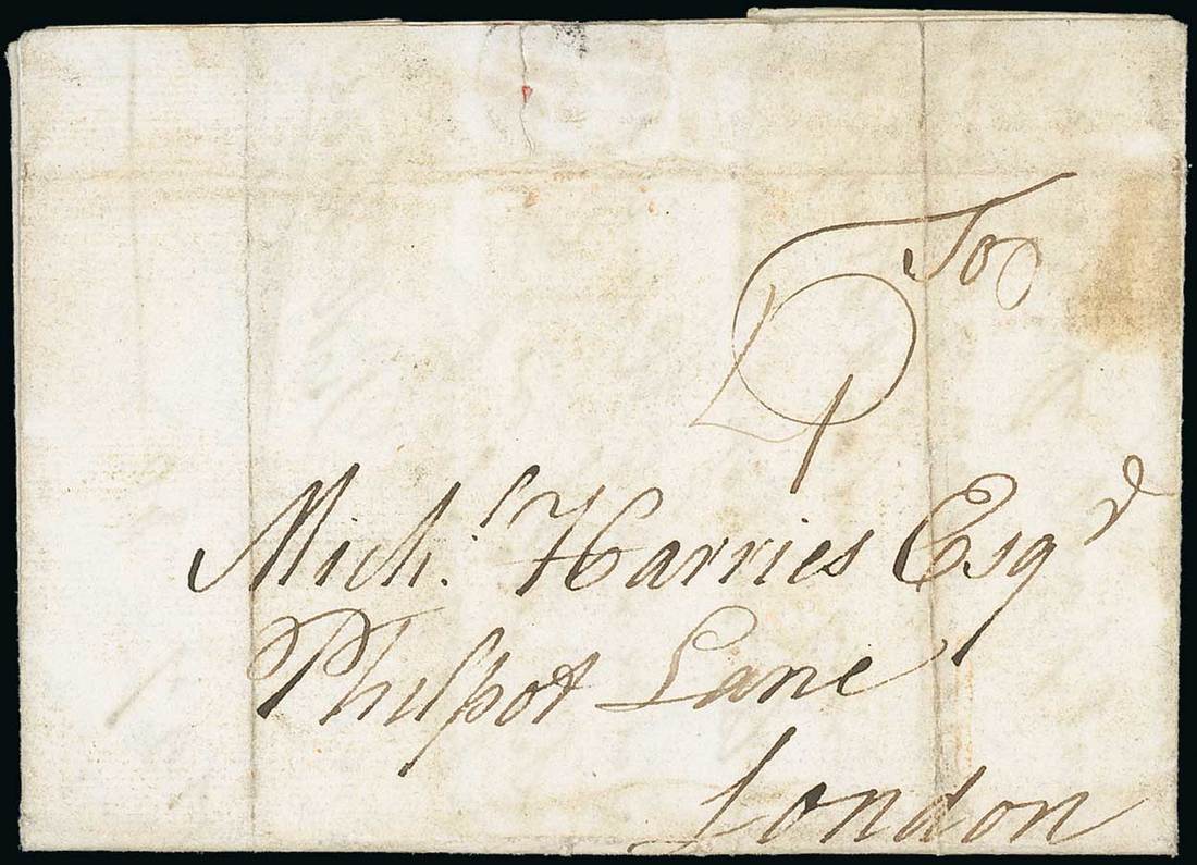 1780 (27 Jan.) entire letter from Robert Forbes, Captain of H.M.S. Apollo, to London and showing, on reverse, "ply/mouth" h.s. alongside "6/mr" Bishopmark; extraordinary content including "on the 8th of Janry we fell in with a Spanish Fleet of Marchant Ships bound to Cadiz which consisted of 22 Sail and one 64 for their Convoy which was taken without one Escaping - On the 16do. we made Cape St. Vincent.... at 4 in the Afternoon saw 13 Sail of Ships which we took for the Spanish Fleet.....and Engaged the Spanish Comadore we run so close alongside of him within I suppose our ship's length we gave him some very warm broadsides which he returned but after ¾ of an hour fire she Blue up this was a 74 with 600 men & not one saved although she was an enemy it was a shocking sight for had we been much nearer we must shared the same fate it was then five O'clock and turning dark....and a general fire ensued throughout the whole fleet....the Spanish ship was much hurt both in hull & rigging...Killed Lt. Marines and 7 Seamen/Wounded 13 Seamen". A wonderfully descriptive letter from the Great Siege. Photo