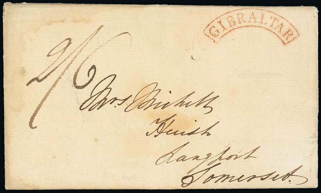 1807 (5 Dec.) entire letter to Somerset, rated "2/6" and showing superb curved-framed "gibraltar" in red. Photo