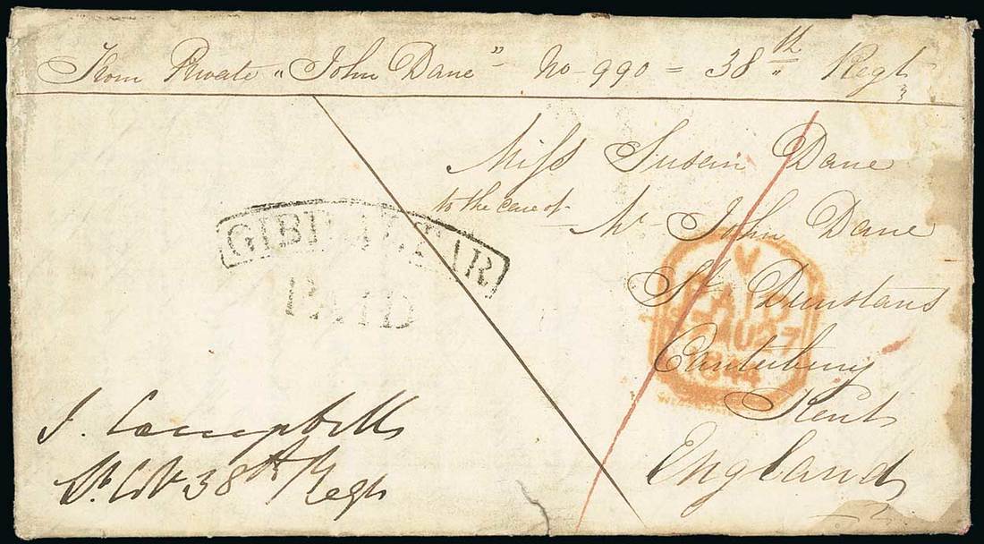 1844 (10 Aug.) entire letter "From Private John Dane No. 990 — 38th. Regt." to Canterbury, marked "1" in red ink and showing fine 2nd. Type curved "gibraltar/paid" handstamp and London tombstone Paid d.s. in red, arrival c.d.s. on reverse. A fine letter from Private Dane who is in hospital feigning sickness, and which gives details of garrison routine and reference to the Franco-Moroccan War, which ended shortly after the letter was written. Photo