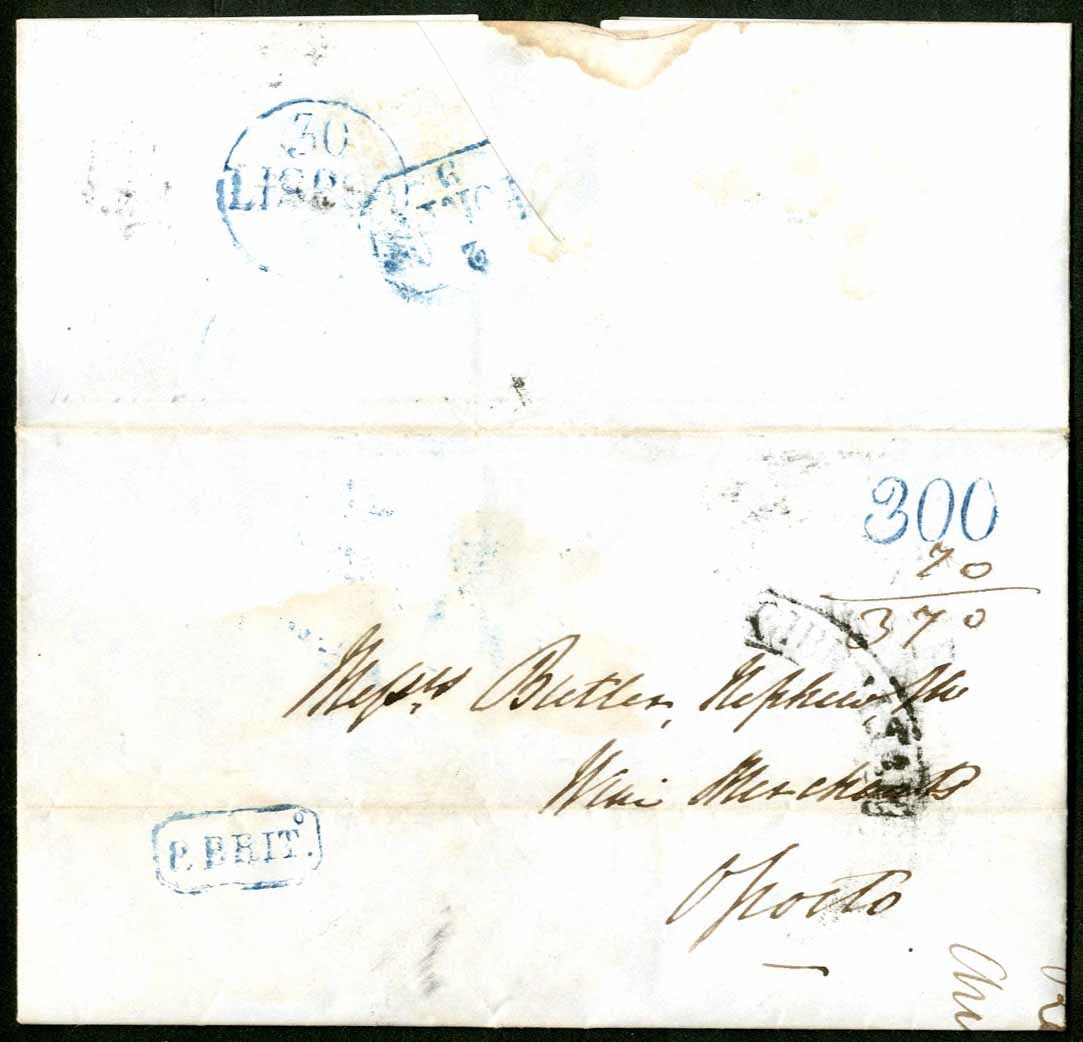 1846 (27 Aug.) entire letter to Oporto, showing curved-framed "gibraltar", framed "p.brit" and "300" rate handstamp, both in blue with the latter completed for "370" Reis