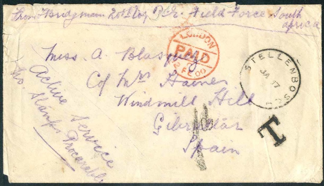 1900 (17 Jan.) soldier's envelope "From J Bridgman 20th. Roy. Regt., Field Force South Africa" to Gibraltar, marked "Active Service No Stamps Procurable" and showing Stellenbosch c.d.s., London transit c.d.s. (12.2), large "1d" h.s. and with "T" handstamps struck on arrival, Cape Town transit c.d.s. (18.1) on reverse; minor edge faults though a rare destination for mail from the Boer War