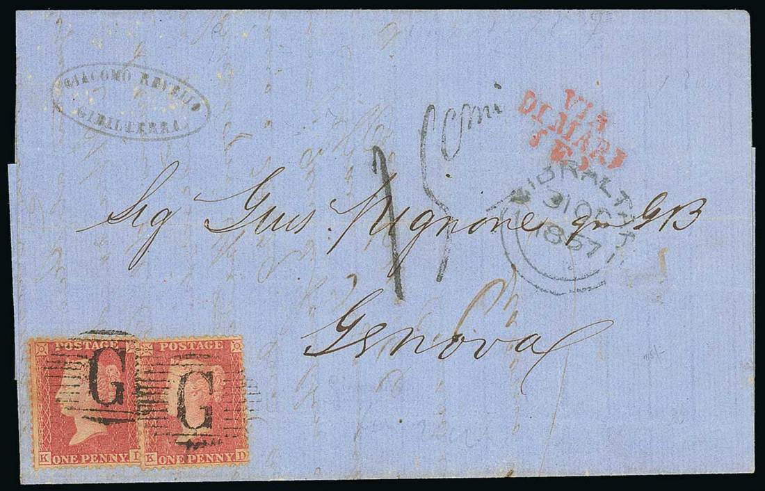 1857 (31 Oct.) entire to Genoa, bearing 1d. rose-red (2) each cancelled with a superb strike and showing despatch double-arc datestamp, "via/di mare/(e)" handstamp in red and "15 Cmi" rate mark, arrival datestamp on reverse (5.11); an unusual 2d. rate franking. Photo