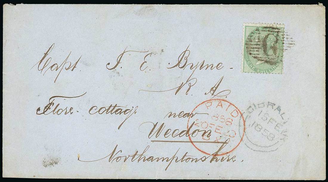 1858 (15 Feb.) envelope to Northamptonshire, bearing 1/- green with a largely fine strike and showing despatch double-arc datestamp alongside London Paid datestamp (20.5), Weedon datestamp on reverse. Photo