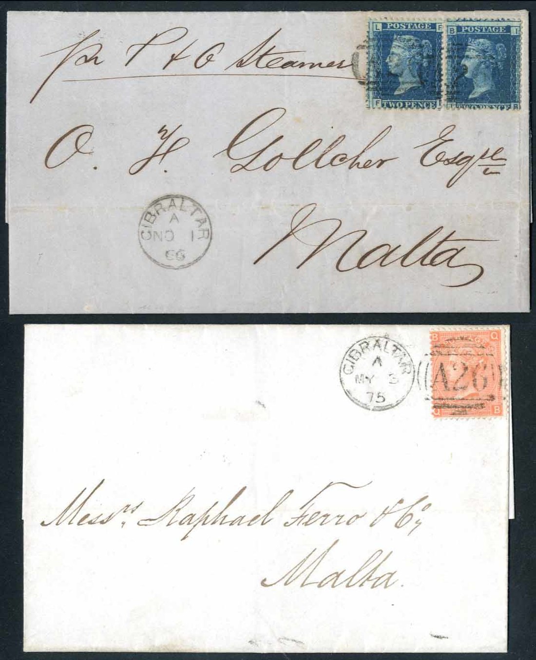 1866 (1 Nov.) entire letter to Malta bearing 2d. blue Plate 9 (2) both cancelled "A26" and with despatch datestamp at foot, and 1875 (May) entire letter to Malta bearing 4d. vermilion Plate 14 cancelled with horizontal duplex, both with arrival datestamps on reverse; an attractive pair