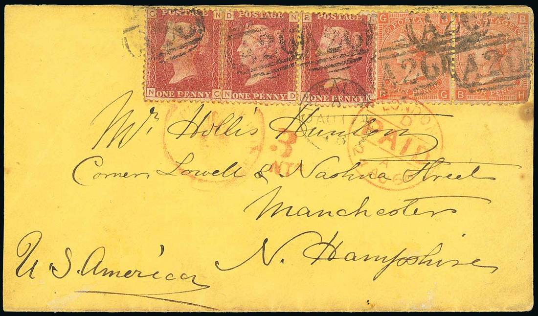1868 (Aug.) yellow envelope to U.S.A., bearing 4d. vermilion Plate 9 pair (faults at right) and 1d. Plate 111 severed strip of three cancelled with multiple strikes of the "A26" and additionally tied by despatch and other datestamps, a scarce usage of the 11d. rate inly in use for two years; also 1878 envelope (faults) bearing 2½d. rosy mauve with vertical duplex. Photo