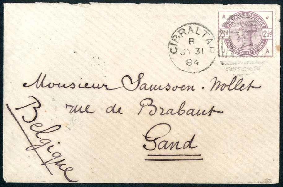 1884 (31 July) small envelope to Gand, Belgium, bearing 1883-84 2½d. lilac cancelled with vertical duplex, arrival datestamp on reverse; attractive and an unusual destination