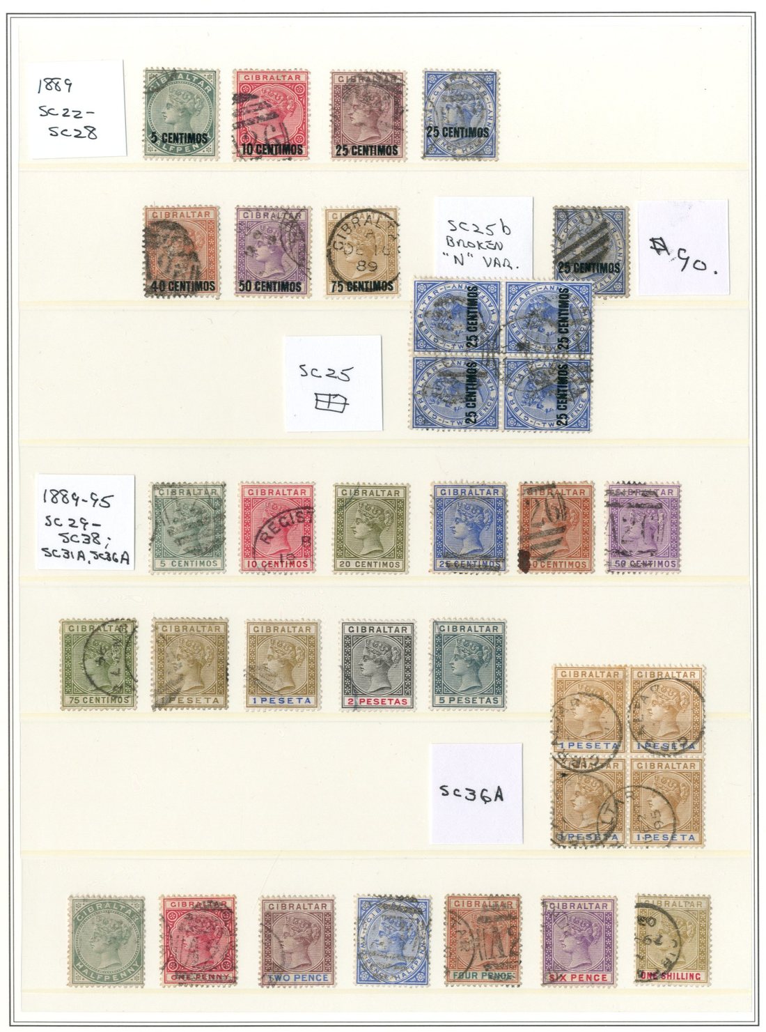 1886 on Bermuda set of seven (all with apparent genuine overprints), 1886-87 4d., 6d. and 1/-, 1889 Centimes set with additional 25c. on 2½d. block of four and a single with variety broken "n", 1889-96 set less 20c. shade and with 1p. bistre and ultramarine block of four, 1898 set of seven and 1d. (3, one bisected) on piece; fair to fine. Viewing recommended