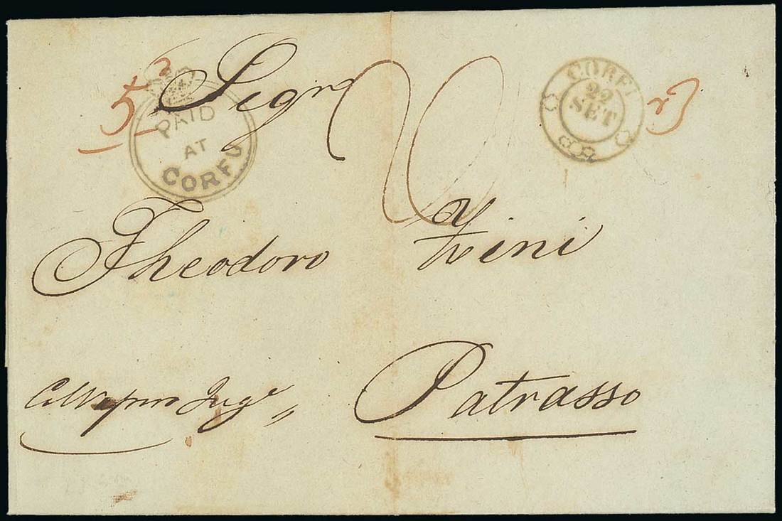 1847 (21 Sept.) entire letter to Patras, showing fine Crowned Circle "paid/at/corfu" and Corfu datestamp, both in grey-black, arrival datestamp on reverse. S.G. CC2, £650. Photo