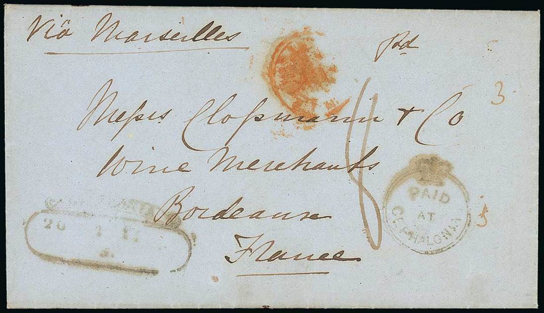 1851 (19 Dec.) entire letter from Cephalonia "via Marseilles" to Bordeaux, rated "8" and showing Crowned Circle "paid/at/cefalonia" and scroll datestamp at foot, French entry datestamp at top, the reverse with Malta (23.12) and arrival (3.1) datestamps. Scarce. S.G. CC1, £1,800. Photo