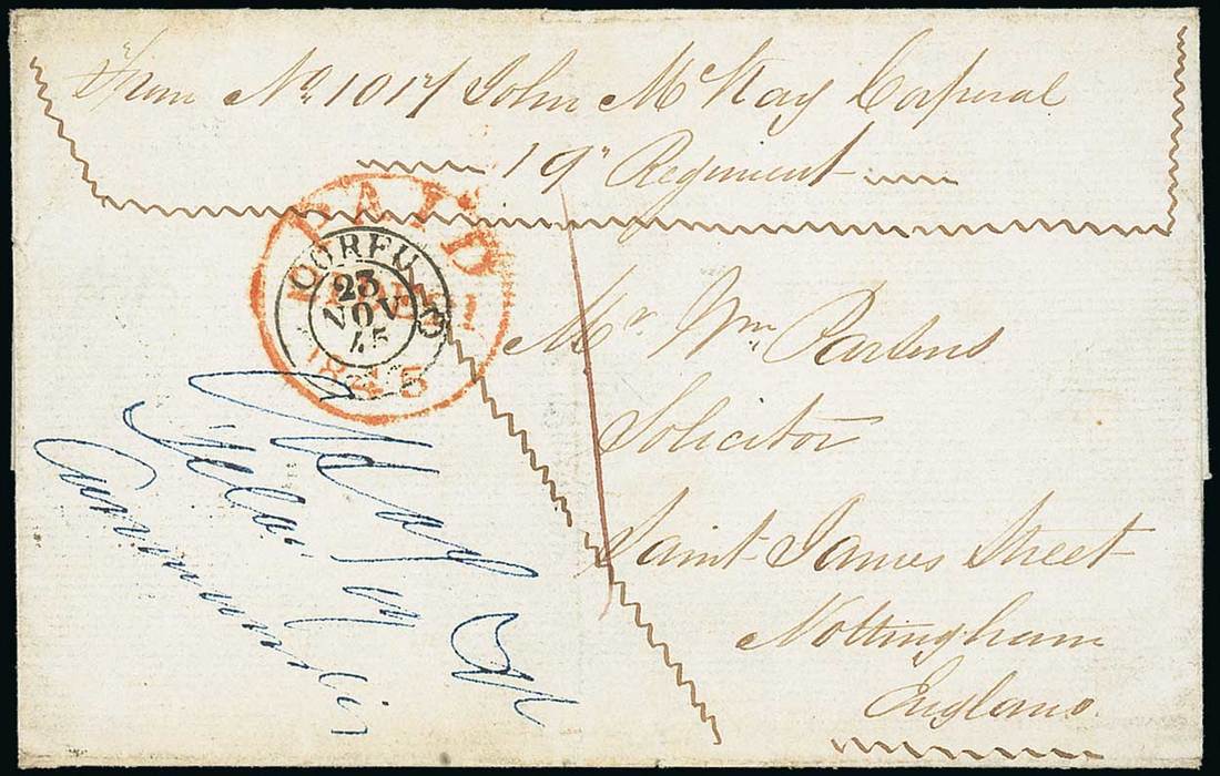 1845 (23 Nov.) entire "From No. 1017 John McKay Corporal 19 Regiment" to Nottingham, showing manuscript "1" in red and fine Corfu double-ring datestamp over-cancelled by London Paid c.d.s. in red, arrival datestamp on reverse; clean and attractive. Photo