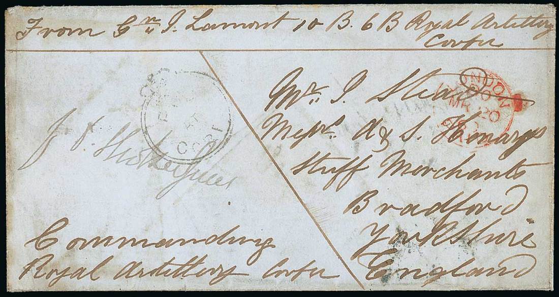 1860 (c. Mar.) entire from "Gn. J. Lamont 10 B. 68. Royal Artillery, Corfu" to Bradford, showing a light strike of Crowned Circle "paid/at/corfu" and fine London Paid datestamp (20.3), arrival datestamp on reverse. A rare concessionary rate cover with the Crowned Circle. Photo